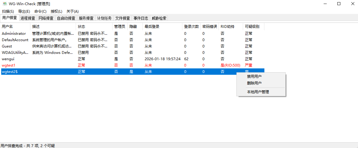 枚举系统所有用户账户(包括隐藏用户)基础信息、识别克隆账户和异常权限。