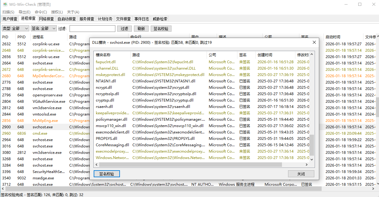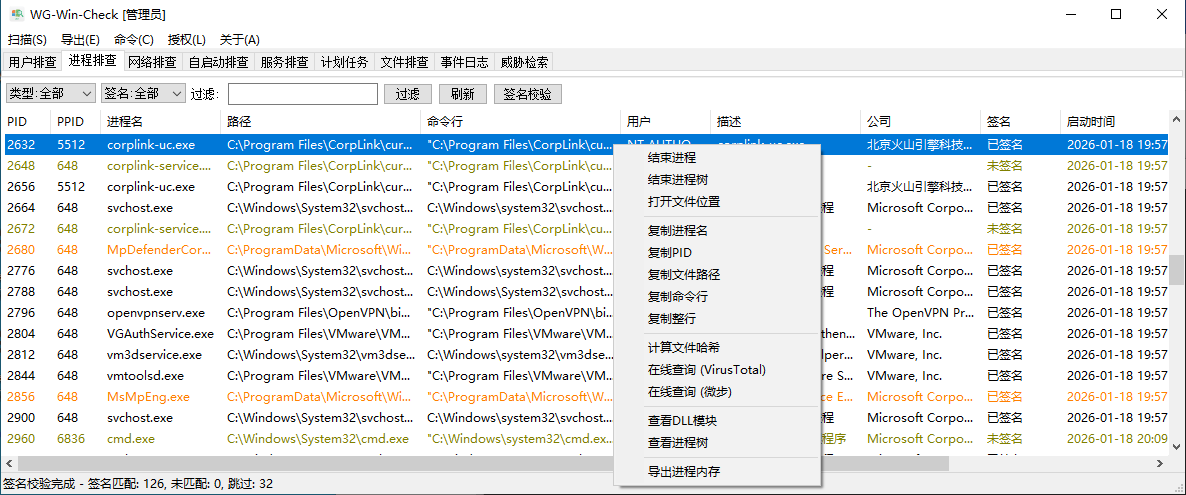 进程排查 - 监控系统进程,进程树查看、DLL分析、签名验证和在线威胁查询,标注可疑进程