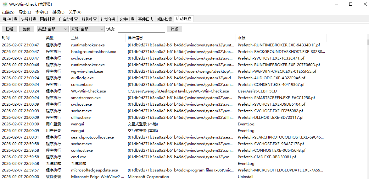 聚合用户常见活动,解析UserAssist、Prefetch、最近访问、登录等多种活动来源,梳理程序执行、最近访问等活动时间线。