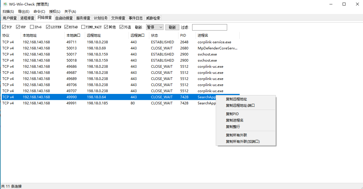 监控所有 TCP/UDP 连接 ,展示基础连接信息及关联进程,支持按协议、状态、外联、关键字进行快速过滤筛选,提供一键提取所有外联 IP。