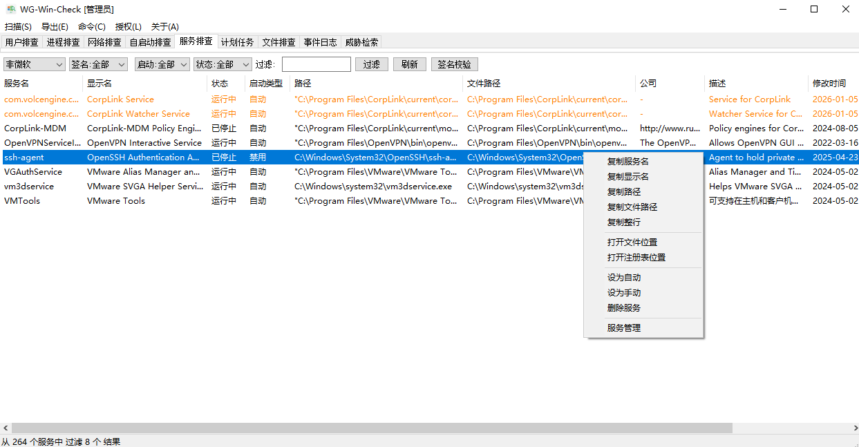 枚举所有系统服务,可基于服务类型、签名、启动类型、服务状态进行过滤,包含签名校验及其他基础风险高亮规则,同时可快捷管理服务。