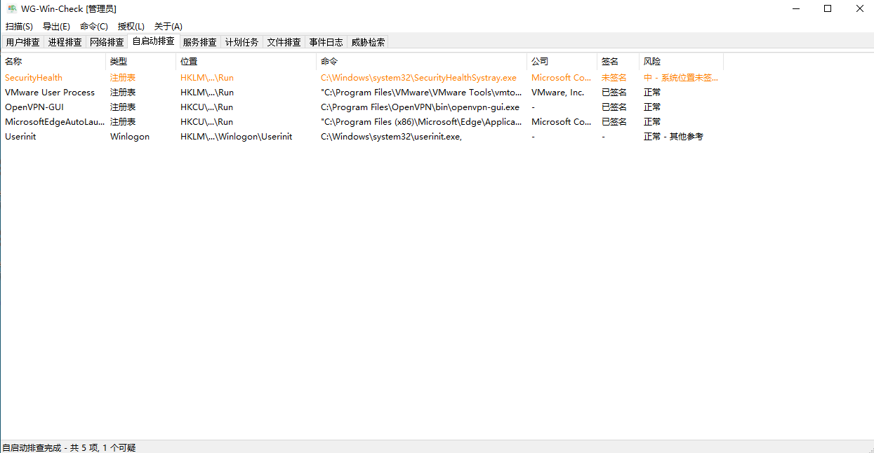扫描系统常见启动项,包括:注册表启动项(Run、RunOnce、RunServices)、启动文件夹、Winlogon 劫持、IFEO(映像劫持)等其他驻留手段。