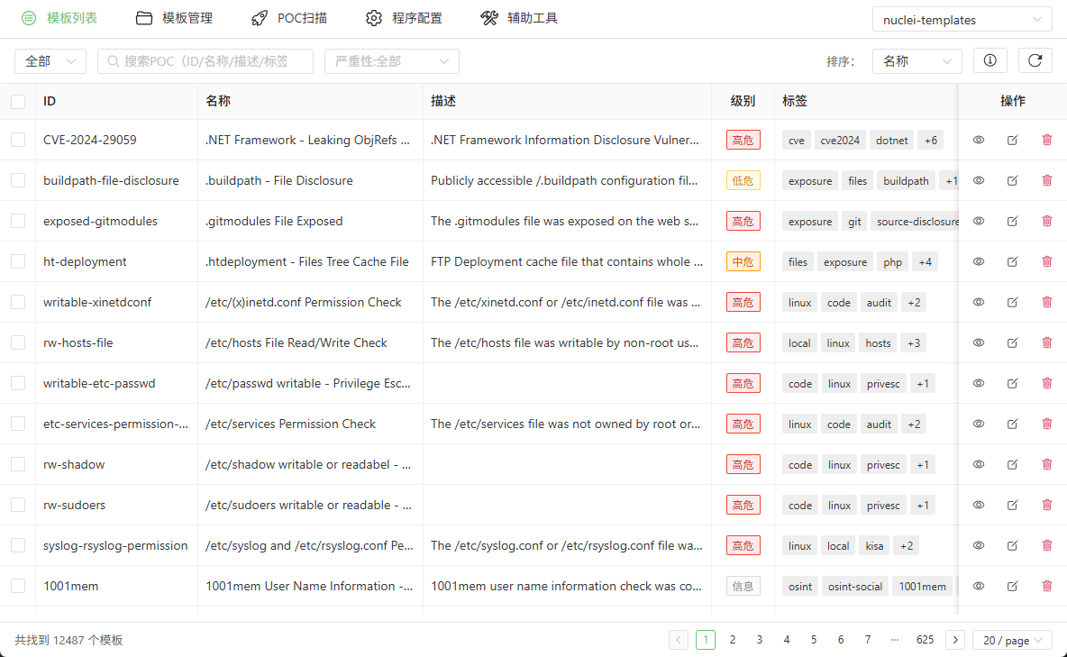 建立 POC 文件映射数据库,扫描提取 POC 核心字段,扫描 Nulcei template 1.2W 文件约 5S。提供常用多维度过滤,便于快捷浏览和检索,同时提供 POC 映射文件查看与编辑功能。