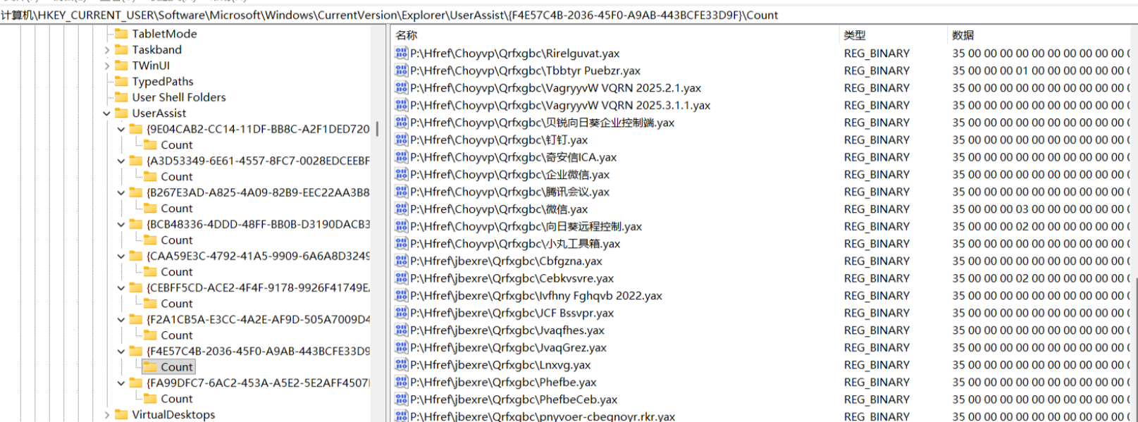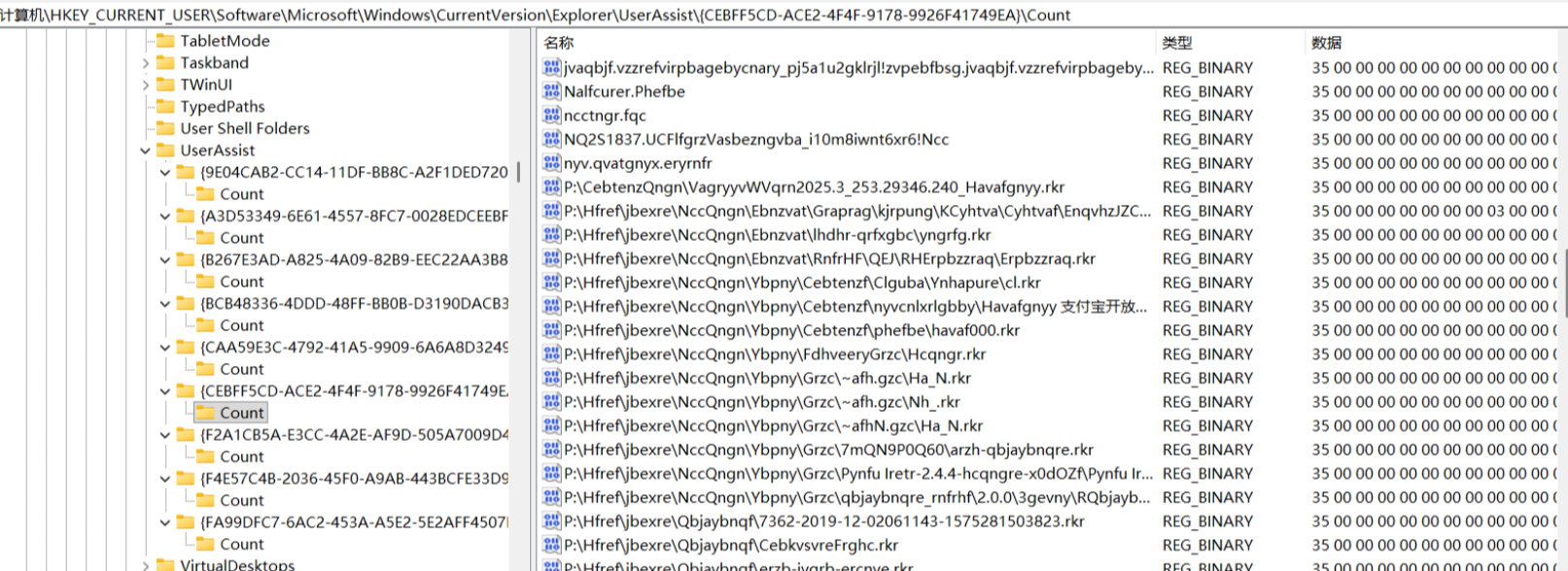 UserAssist 是用来记录用户通过图形界面启动程序行为的一套注册表项。与 Prefetch 不同,它只记录通过双击可执行文件或快捷方式这种“主动交互”方式启动的程序,不包括后台服务、命令行脚本静默启动的进程。因此 UserAssist 更贴近“用户实际上做了什么”这一层面。